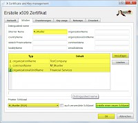 - Zunächst wieder einen neuen privaten Schlüssel erzeugen. Dann einen beliebigen Namen für das Client-Zertifikat eingeben, hier beispielsweise M_Mueller. Anschließend die Eingaben für den ASN.1 Namen des Client_Zertifikats wie gewünscht eingeben. Der Name muss später als entfernte Identität auf dem Lancom Router konfiguriert werden.