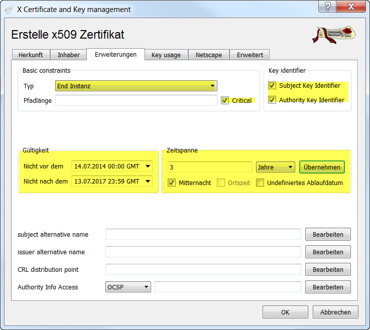 - Unter dem Reiter <Erweiterungen> den Typ <End Instanz> auswählen und die Checkboxen <Critical>, <Subject Key Identifier> und <Authority Key Identifier> klicken. Dann wieder die gewünschte Gültigkeit für das Client-Zertifikat einstellen